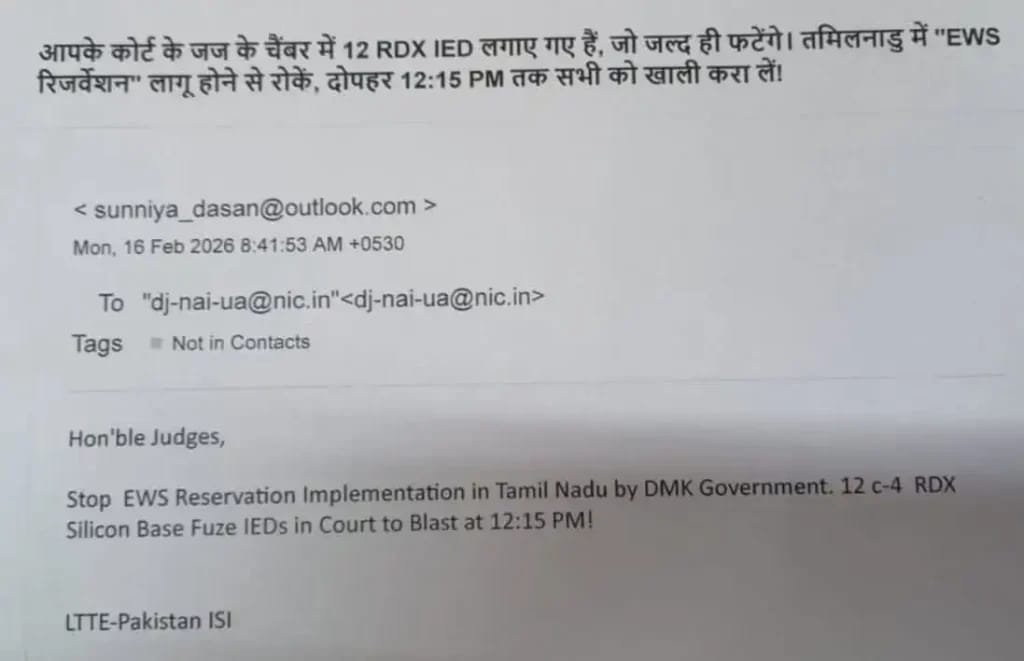 नैनीताल- सोमवार सुबह नैनीताल डिस्ट्रिक्ट कोर्ट को बम से उड़ाने की धमकी मिलने के बाद प्रशासन और पुलिस महकमे में हड़कंप मच गया। जिला जज को एक धमकी भरा ई-मेल प्राप्त हुआ, जिसमें कोर्ट परिसर में विस्फोटक लगाए जाने का दावा करते हुए दोपहर 12:15 बजे धमाका होने की चेतावनी दी गई थी। ई-मेल में तमिलनाडु में EWS आरक्षण लागू करने का विरोध जताने का जिक्र किया गया है। संदेश में “EWS Reservation Implementation in Tamil Nadu by DMK Government” को रोकने की बात कहते हुए विस्फोट की धमकी दी गई है। आशंका जताई जा रही है कि संबंधित व्यक्ति या समूह इस नीति के विरोध के नाम पर भय का माहौल बनाने की कोशिश कर रहा है।