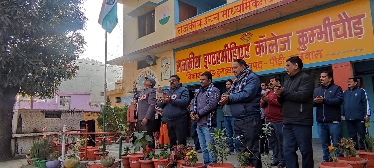 कोटद्वार- रा०इ0का0 कुम्भीचौड़ में 75वाँ गणतंत्रता दिवस हर्षोल्लास के साथ मनाया गया। विद्यालय परिसर से निकटवर्ती ग्राम कुम्भीचौड़, नाथूपुर, जीतपुर, विशनपुर तक प्रभात फेरी निकाली गयी। रैली में भारत माता की जय। जय जवान जय किसान जय विज्ञान / वीर क्रांतिकारी नेता अमर रहे / वीर सैनिक अमर रहे आदि के नारे लगाये। विद्यालय के प्रधानाचार्य श्री लखपत राज खुगशाल, ने राष्ट्रीय ध्वज फैराया गया।