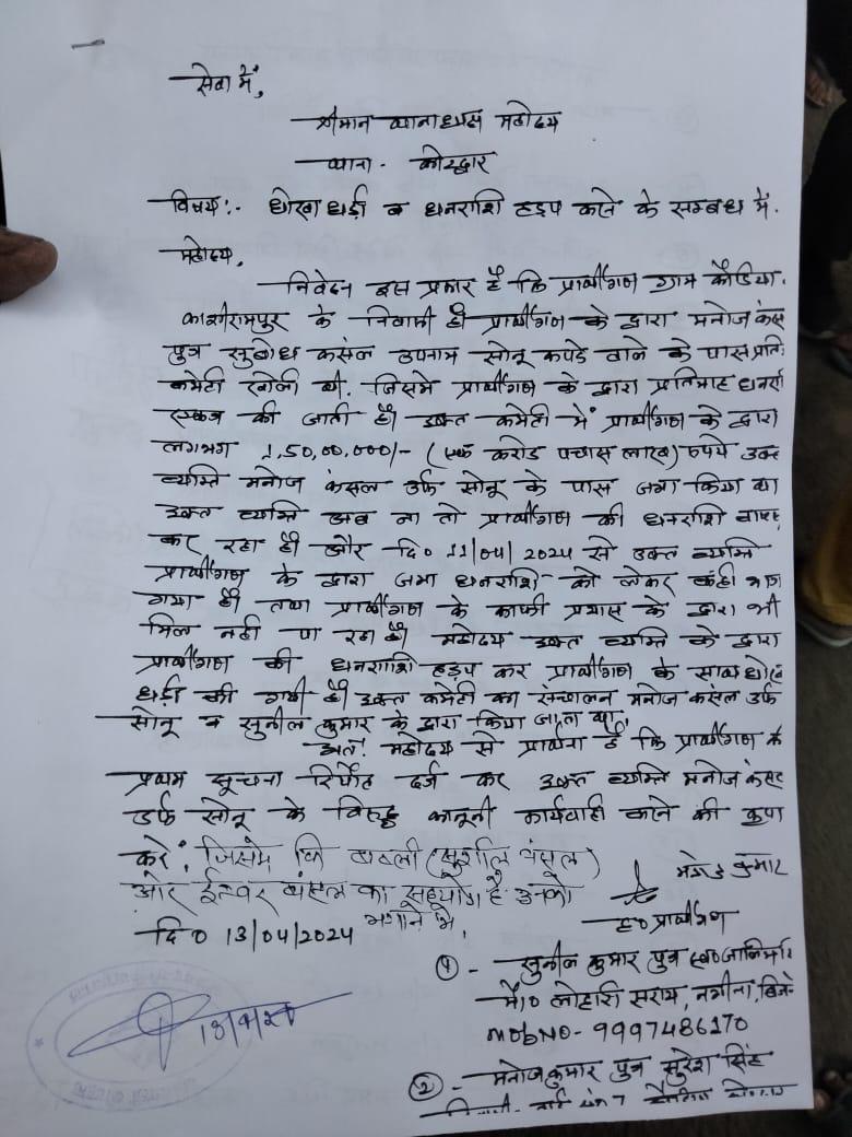 कोटद्वार- नगर निगम क्षेत्र के अंतर्गत नजीबाबाद रोड कोड़िया निवासी कपड़ा व्यापारी मनोज कंसल उर्फ सोनू लोगों की कमेटी का करीब डेढ़ करोड़ रुपए लेकर फरार हो गया है। मामले में पीड़ित लोगों ने पुलिस को तहरीर देकर न्याय की गुहार लगाते हुए उनके पैसे वापस दिलाने की मांग की है। कोटद्वार कोतवाली पुलिस को दी गई तहरीर में लोहारी सराय, नगीना, जनपद बिजनौर (उप्र) निवासी सुनील कुमार ने बताया कि नगर निगम क्षेत्र का नजीबाबाद रोड कोड़िया निवासी कपड़ा व्यापारी मनोज कंसल उर्फ सोनू कमेटी चलाता है।