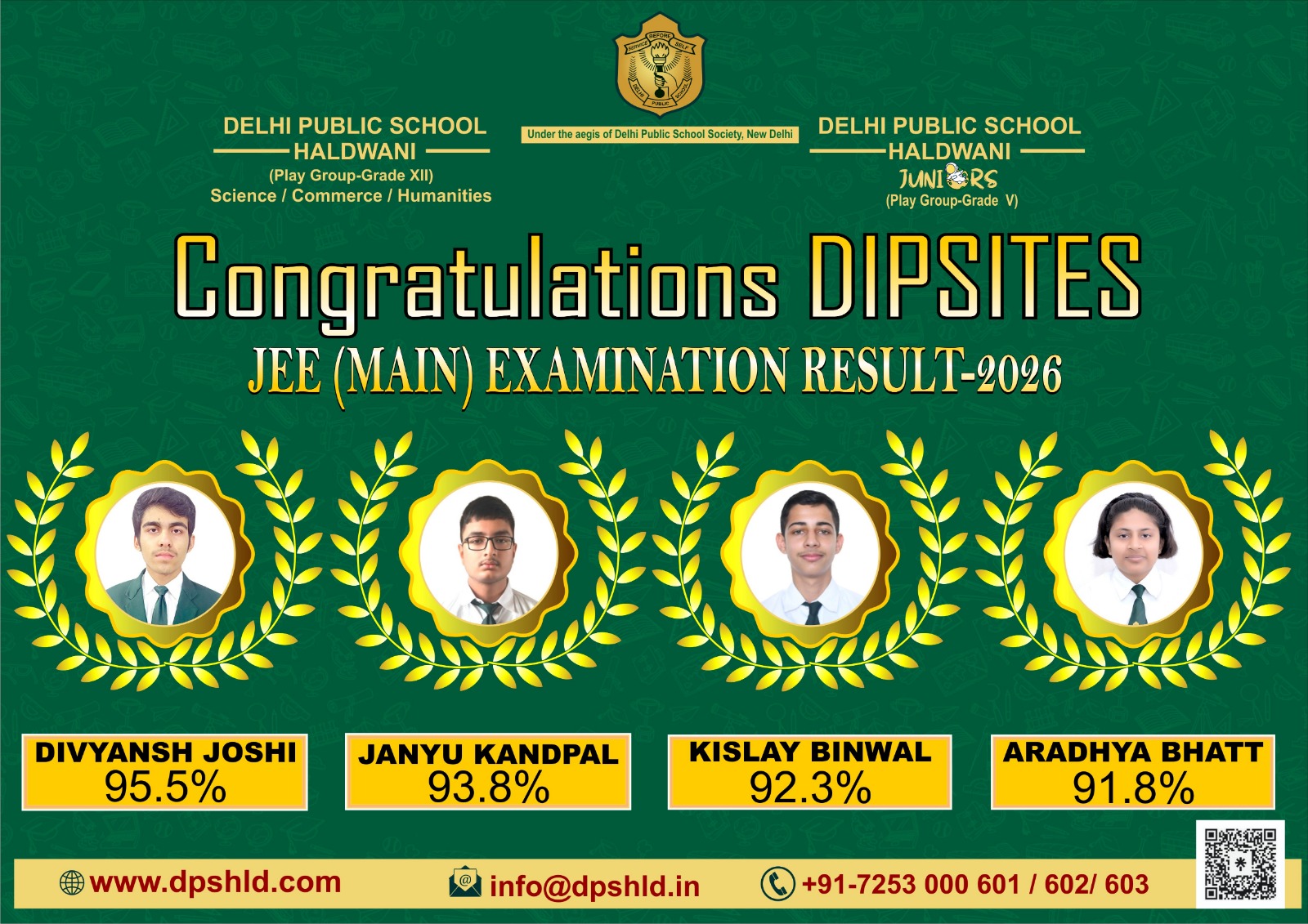 हल्द्वानी – दिल्ली पब्लिक स्कूल (डीपीएस) हल्द्वानी के विद्यार्थियों ने जेईई (मेन) 2026 में शानदार प्रदर्शन करते हुए विद्यालय और पूरे क्षेत्र का नाम रोशन किया है। चार विद्यार्थियों ने 90 प्रतिशत से अधिक अंक प्राप्त कर अपनी प्रतिभा और मेहनत का लोहा मनवाया।