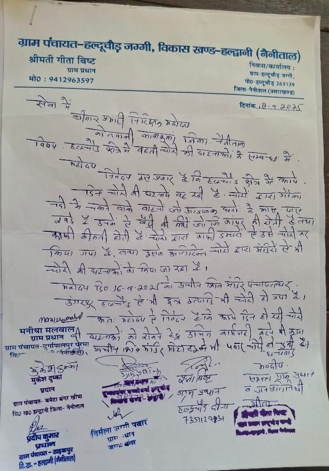 हल्दूचौड़ – क्षेत्र में लगातार बढ़ रही चोरी और आपराधिक घटनाओं ने ग्रामीणों का जीना मुश्किल कर दिया है। हालात यह हैं कि लोग दहशत में हैं, लेकिन पुलिस की उदासीनता से समस्याएं और गहराती जा रही हैं। इसी मुद्दे को लेकर गुरुवार को क्षेत्र के कई ग्राम प्रधान सामूहिक रूप से कोतवाली लालकुआं पहुंचे और कोतवाल को ज्ञापन सौंपने का प्रयास किया।